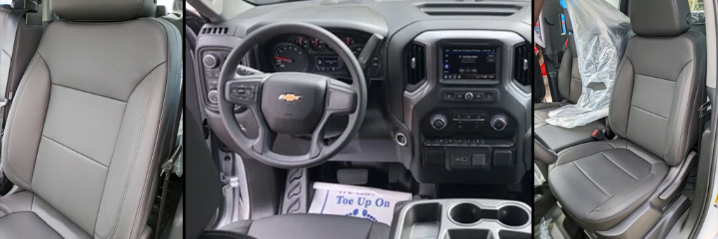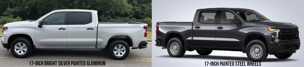 Also, note the ‘Silverado’ hard badge on the front fender, followed by a set of black door handles and mirrors. Though the standard wheels are 17-inch painted steel wheels, we believe the $350 of MSRP is worth it to use the 17-inch bright silver painted aluminum wheels instead. See the picture above of one of our work trucks with these wheels and compare to the stock image of the 17-inch steel wheels. We believe your resale value on the truck will be at least $350 better by having the more attractive look of the aluminum wheels. Additionally, the truck will look a lot better while you own it.