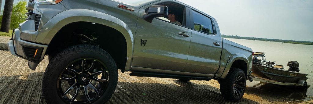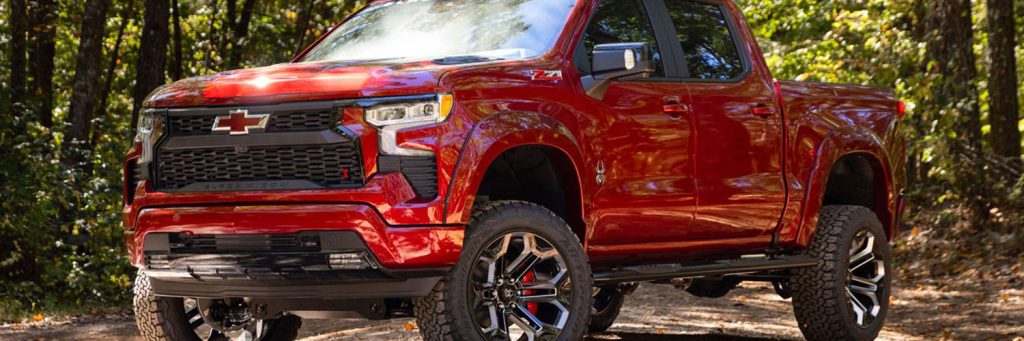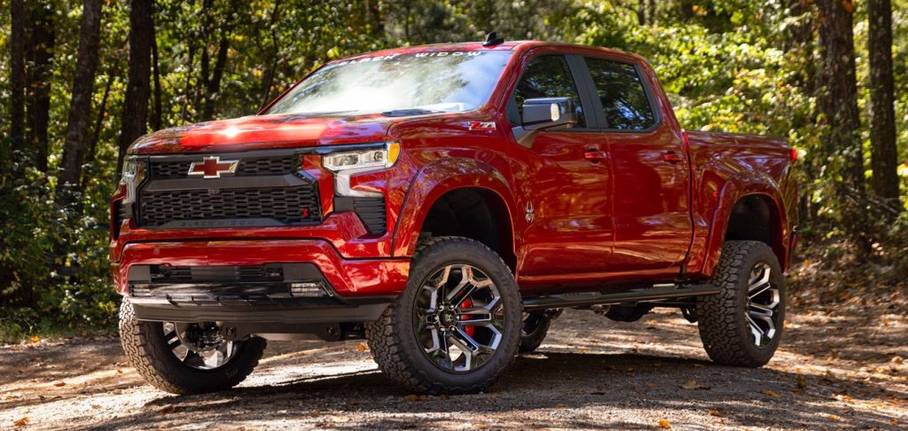 The Black Widow Silverado 1500 is a custom pickup truck offering a blend of class, luxury, and commanding presence. It boasts a 6″ Suspension Lift Kit, FOX’s proven damping technology for comfortable and predictable ride handling, and 35″ AT KO2 all-terrain tires from BFGOODRICH®. Unique aesthetic features such as 20″ wheels with customizable black painted rings, a bold proprietary Black Widow grille, and black hood vents contribute to its distinct look. With premium leather seating, custom upholstery, and red LED interior lights, the Black Widow offers a luxurious interior experience. The truck is also embellished with OE quality custom badging, showcasing the recognized spider logo and Black Widow name, reinforcing its premium status.
