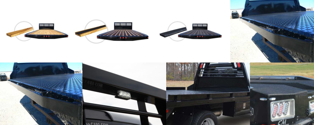 Other available options include a cargo light, bail spike, 30,000lb. B&W turnover ball, CM Truck Beds 5th wheel companion, gooseneck trough, drop-in side rails, rear rub rail, dovetail, CM Truck Beds stainless steel fenders, color primer only, and fold down side rails.