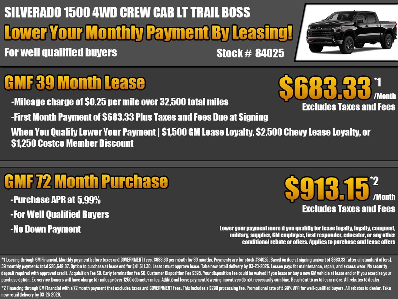 While we make every effort to ensure the data listed here is correct, there may be instances where some of the factory rebates, incentives, options or vehicle features may be listed incorrectly as we get data from multiple data sources, and in some instances, we are unable to change the information provided even if it is inaccurate, or such changes needed cannot happen in a timely manner. This happens occasionally with information provided by General Motors (GM) from its systems. PLEASE MAKE SURE to confirm the details of this vehicle (such as what factory rebates you may or may not qualify for) with the dealer to ensure its accuracy. Dealer cannot be held liable for data that is listed incorrectly due to errors on the part of GM or due to timeliness of updates such as the change in pricing at the beginning of a month.