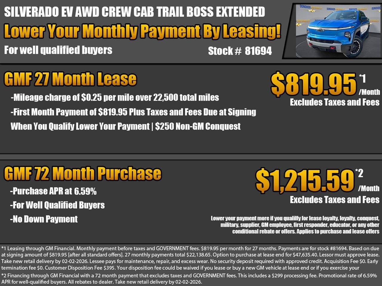 TRAILERING INTEGRATION PACKAGE includes (UKW) Blind Zone Steering Assist with Trailering and (TRG) Trailer Camera Views and Provisions, TECH PACKAGE includes (DRZ) Rear Camera Mirror, (T3V) cargo center high mount stop lamp, (UVN) Bed View Camera, (UV6) Head-Up Display and (ZL6) Trailer Integration Package, SUPER CRUISE PACKAGE includes (UKZ) Enhanced Automatic Parking Assist, (ULM) Driver Attention Assist and (UKL) Super Cruise, PREMIUM PACKAGE includes (AS3) Super Cruise Package, (ZM9) Comfort and Convenience Package, (Y5T) Tech Package, (UV6) Head-Up Display, (ZL6) Trailer Integration Package, (QK2) Multi-Flex tailgate, (CGN) Chevytec spray-on bedliner, (ESG) Multi-Flex Midgate, (KV7) Offboarding Power, (K2O) Charging Module, 19.2 kW high-voltage and (QT5) Manual tailgate function with EZ Lift, power lock and release, LICENSE PLATE BRACKET, FRONT, FRONT MOUNTING PACKAGE (Will be forced on orders with ship-to states that require a front license plate.), COMFORT AND CONVENIENCE PACKAGE includes (A45) driver memory, (AVK) driver 4-way power lumbar, (A7K) passenger 8-way seat adjuster, (AVU) front passenger 4-way power lumbar, (KCB) heated rear outboard passenger seats, (KU9) ventilated driver and front passenger seats, (N38) memory steering column and (UQA) Bose stereo audio system Includes (DX6) Mirrors, outside heated power-adjustable, power-folding and driver-side auto-dimming, side perimeter lighting and memory.) , WHEELS, 18" X 8.5" (45.7 CM X 21.6 CM) (STD), TRANSMISSION, NONE (STD), TRAILER CAMERA VIEWS AND PROVISIONS enables accessory camera TR0, TRAIL BOSS PREFERRED EQUIPMENT GROUP includes standard equipment.