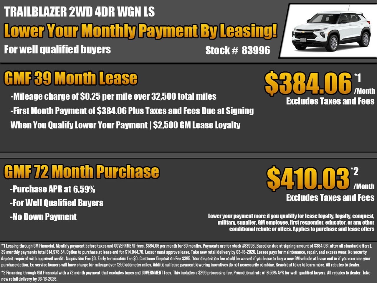 If you wish to have vehicle shipped to you, that is a separate charge determined by distance. Limited Time Price of $24,330. Total Savings from MSRP of $1,000. Must take delivery by 3/16/2026.Delivers 31 Highway MPG and 30 City MPG! This Chevrolet Trailblazer has a durable Gas I3 1.2L/ engine powering this Variable transmission.*Get Your Money's Worth for this Chevrolet Trailblazer with These Options *TRANSMISSION, CONTINUOUSLY VARIABLE (CVT) (STD), TIRE, COMPACT SPARE 16" (40.3 CM) includes 16" (40.3 cm) spare wheel and (Q8E) mechanical jack with tools, LICENSE PLATE BRACKET, FRONT, ENGINE, ECOTEC 1.2L I3 TURBO DOHC DI WITH VARIABLE VALVE TIMING (VVT), E85-COMPATIBLE (137 hp [102 kW] @ 5000 rpm, 162 lb-ft torque [219 N-m] @ 2500 rpm) (STD), Wireless Apple CarPlay/Wireless Android Auto, Wiper, rear intermittent, Windshield, solar absorbing, Windows, power with driver express-up/down and front passenger and rear express-down, Wi-Fi Hotspot capable (Terms and limitations apply. See onstar.com or dealer for details.), Wheels, 17" (43.2 cm) Silver-painted aluminum.