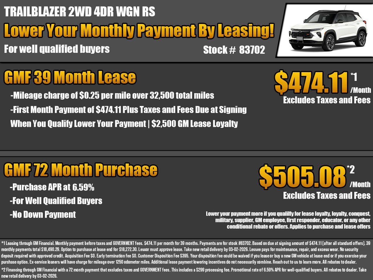 While we make every effort to ensure the data listed here is correct, there may be instances where some of the factory rebates, incentives, options or vehicle features may be listed incorrectly as we get data from multiple data sources, and in some instances, we are unable to change the information provided even if it is inaccurate, or such changes needed cannot happen in a timely manner. This happens occasionally with information provided by General Motors (GM) from its systems. PLEASE MAKE SURE to confirm the details of this vehicle (such as what factory rebates you may or may not qualify for) with the dealer to ensure its accuracy. Dealer cannot be held liable for data that is listed incorrectly due to errors on the part of GM or due to timeliness of updates such as the change in pricing at the beginning of a month.