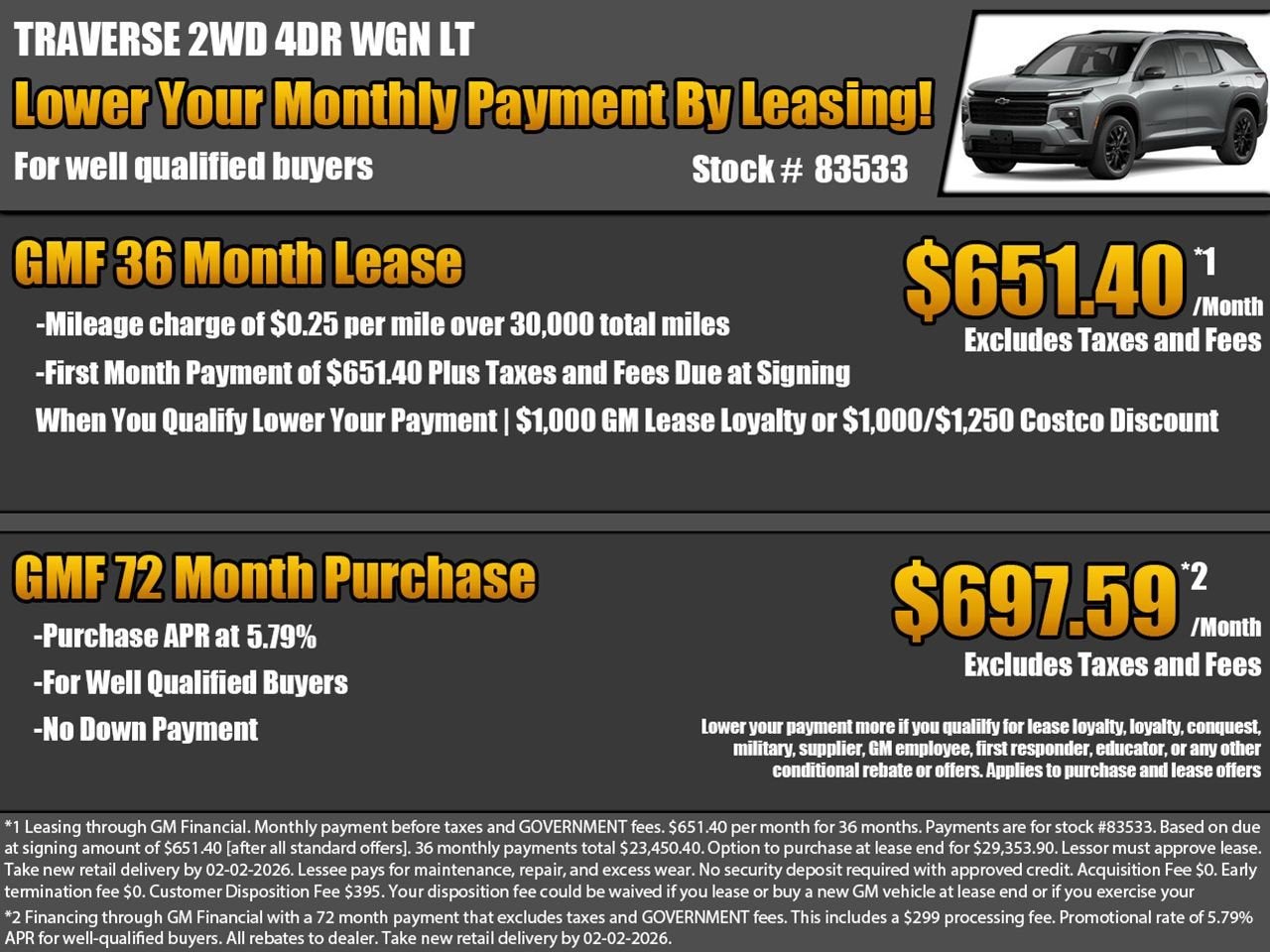 GM US Chevrolet GMF Bonus Cash Program - 26-40ARQualification: This program must be used to reduce the amount financed through one of the GM Financial Promotional Rate Programs (26-40GD-* or 26-40GC-*)$400