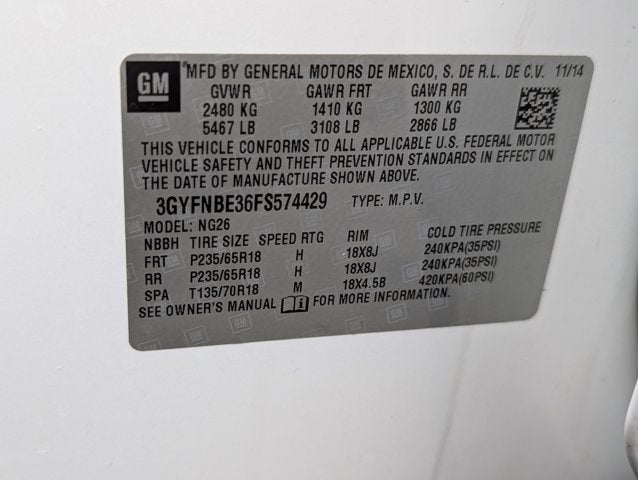 If you wish to have vehicle shipped to you, that is a separate charge determined by distance. Please use the listed price as the most up to date price. Elegantly expressive, this 2015 Cadillac SRX practically sings Puccini. With a Gas V6 3.6L/217 engine powering this Automatic transmission, you will take joy in the astounding ease with which you commandeer the highway. It is stocked with these options: WOOD TRIM includes real Choco Sapele wood on steering wheel (heated) and shift knob, WOOD TRIM includes real Choco Sapele wood on door and center stack. Includes (44F) Wood Trim., WHEELS, 18" X 8" (45.7 CM X 20.3 CM) BRIGHT MACHINED FINISH ALUMINUM (STD), TRANSMISSION, 6-SPEED AUTOMATIC, FWD, 6T70 with tap-up/tap-down (on shifter), performance shifting and manual-up/manual-down (STD), TIRES, P235/65R18 H-RATED ALL-SEASON, BLACKWALL (STD), TIRE, COMPACT SPARE, SHALE W/BROWNSTONE ACCENTS, LEATHER SEATING SURFACES, SEATS, FRONT BUCKET includes 8-way power driver seat adjuster (STD), PLATINUM ICE TRICOAT, and LUXURY COLLECTION PREFERRED EQUIPMENT GROUP Includes Standard Equipment . The Accessories include 1 Master Key.