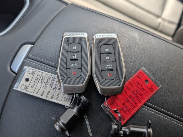 If you wish to have vehicle shipped to you, that is a separate charge determined by distance. Please use the listed price as the most up to date price. Grand and graceful, this 2025 INFINITI QX60 represents a faultless convergence of unparalleled power and beauty. With a Intercooled Turbo Premium Unleaded I-4 2.0 L/122 engine powering this Automatic transmission, you'll delight in the astounding ease with which you command the highway. It comes equipped with these options: MINERAL BLACK, GRAPHITE, LEATHER-APPOINTED SEATING SURFACES, [S55] LITERATURE KIT, [L11] FLOOR MATS W/BENCH SEATS ON 3RD ROW TRAY, [E10] PREMIUM PAINT, [B92] SPLASH GUARDS, Wireless Phone Connectivity, Window Grid And Roof Mount Diversity Antenna, Wheels: 18" x 8J Machined Aluminum Alloy -inc: charcoal metallic finish, and Valet Function . The Accessories include 2 Master Keys.